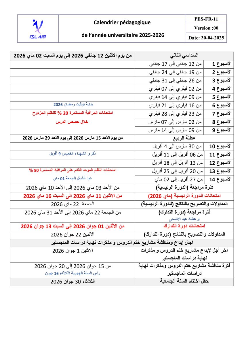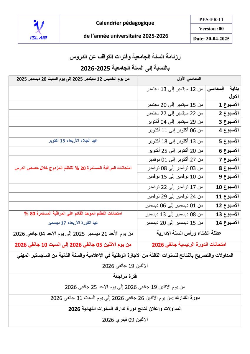Calendrier pédagogique de l’année universitaire 2025-2026