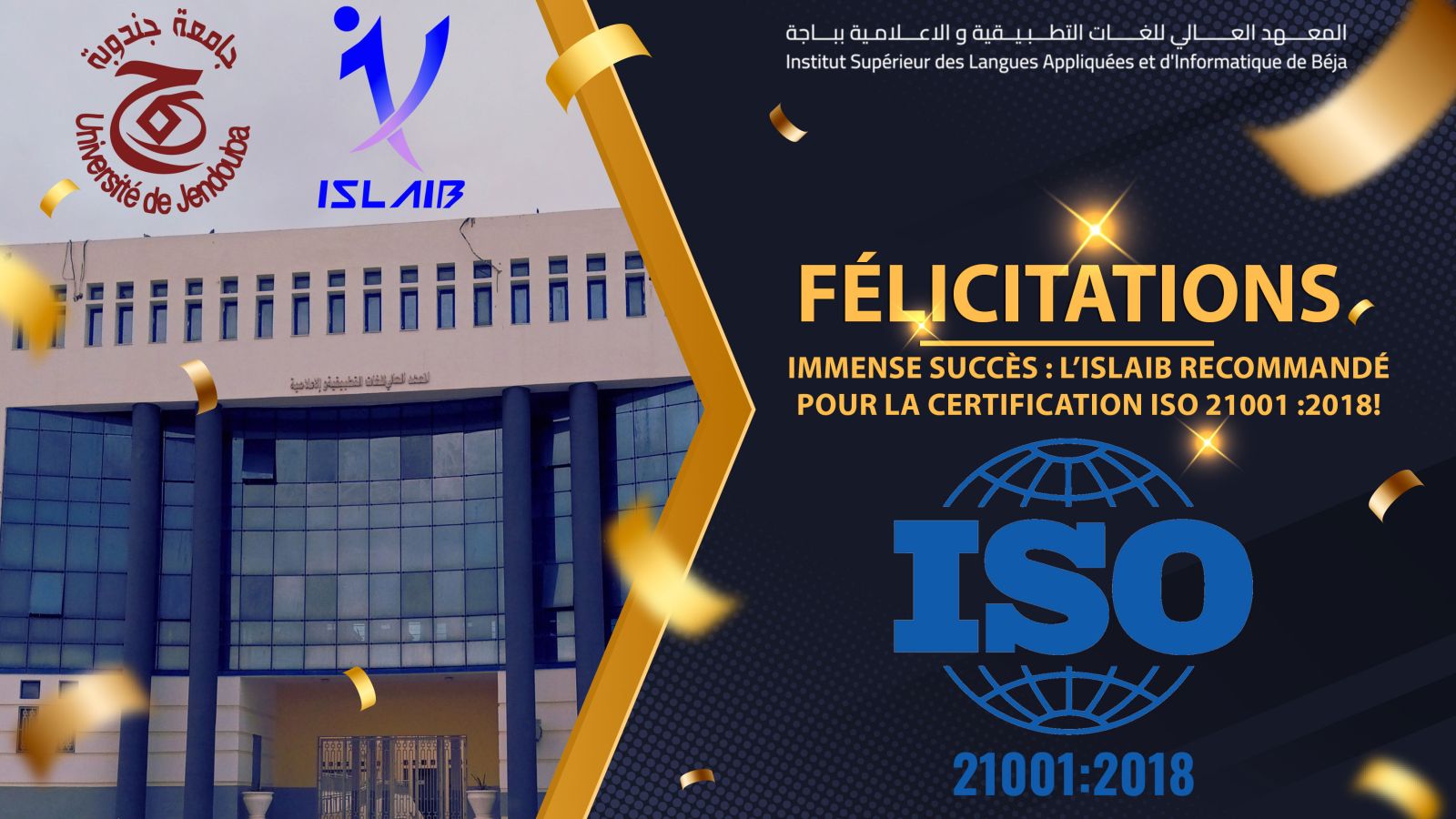C’est avec joie et fierté que nous annonçons que l’Institut Supérieur des Langues Appliquées et d’Informatique de Béja (ISLAIB) a été recommandé pour la certification ISO 21001 :2018