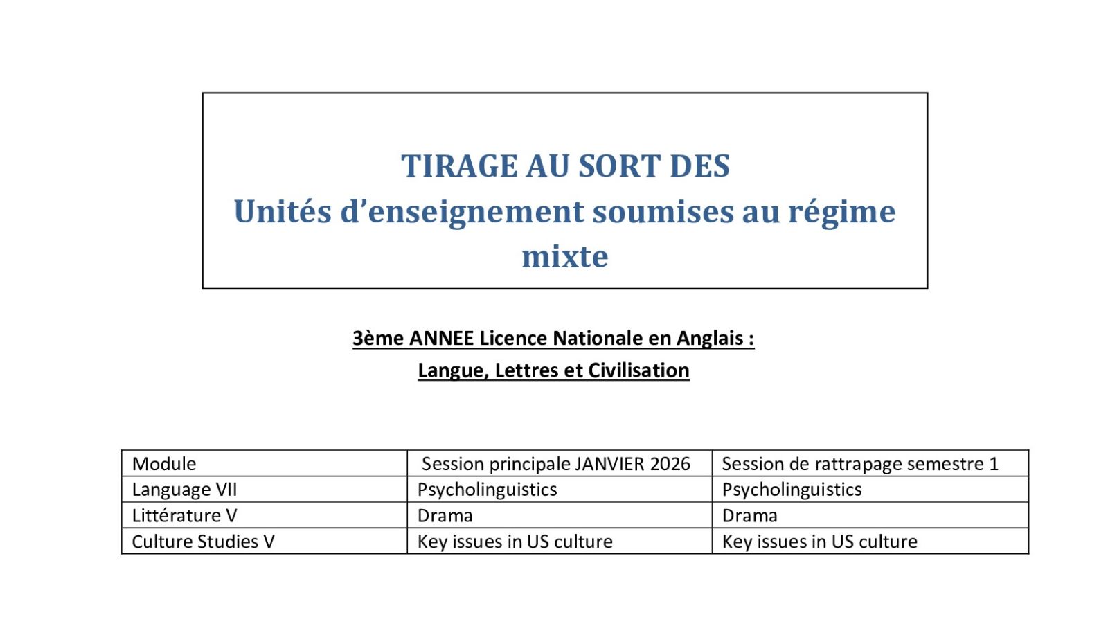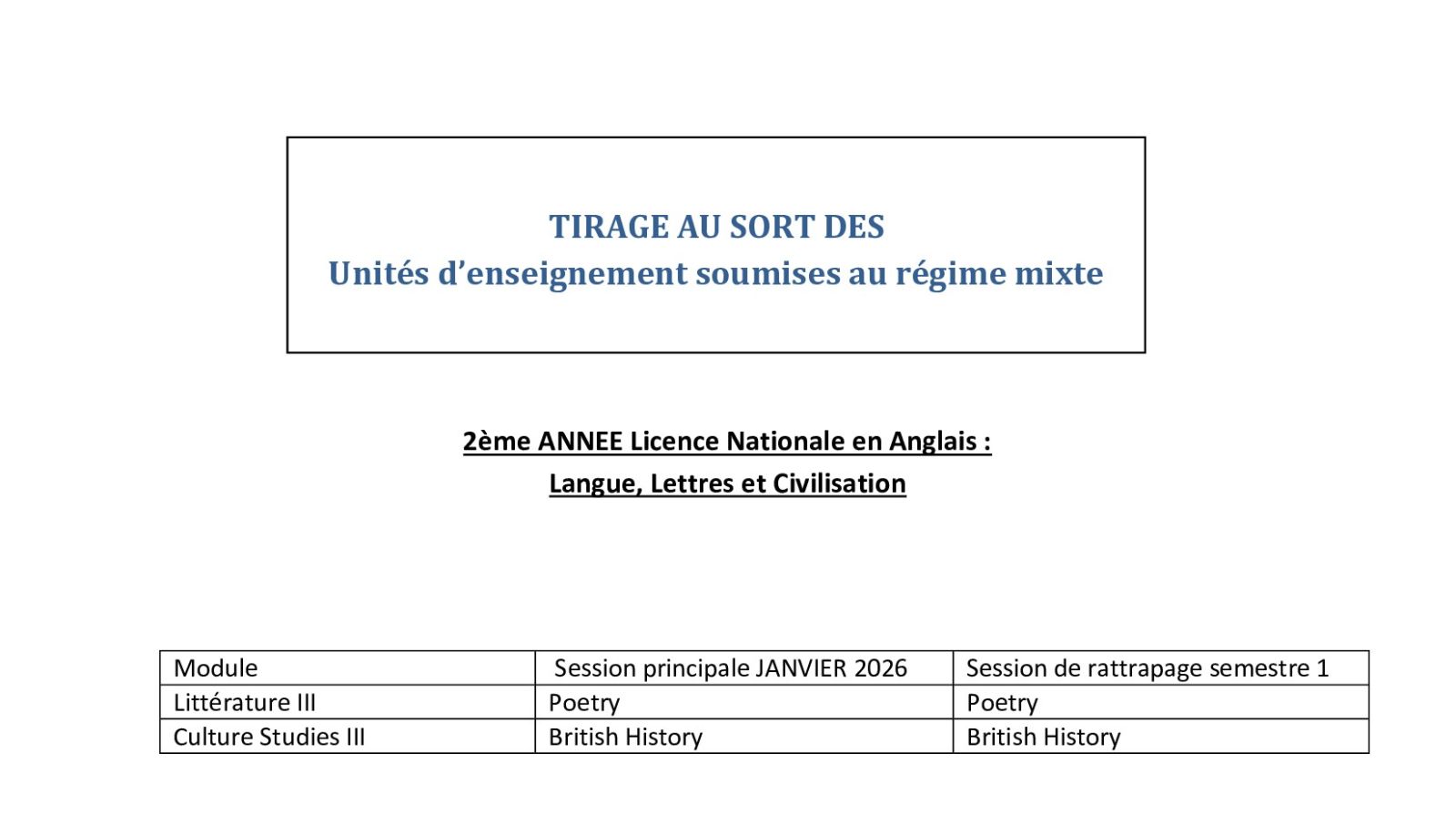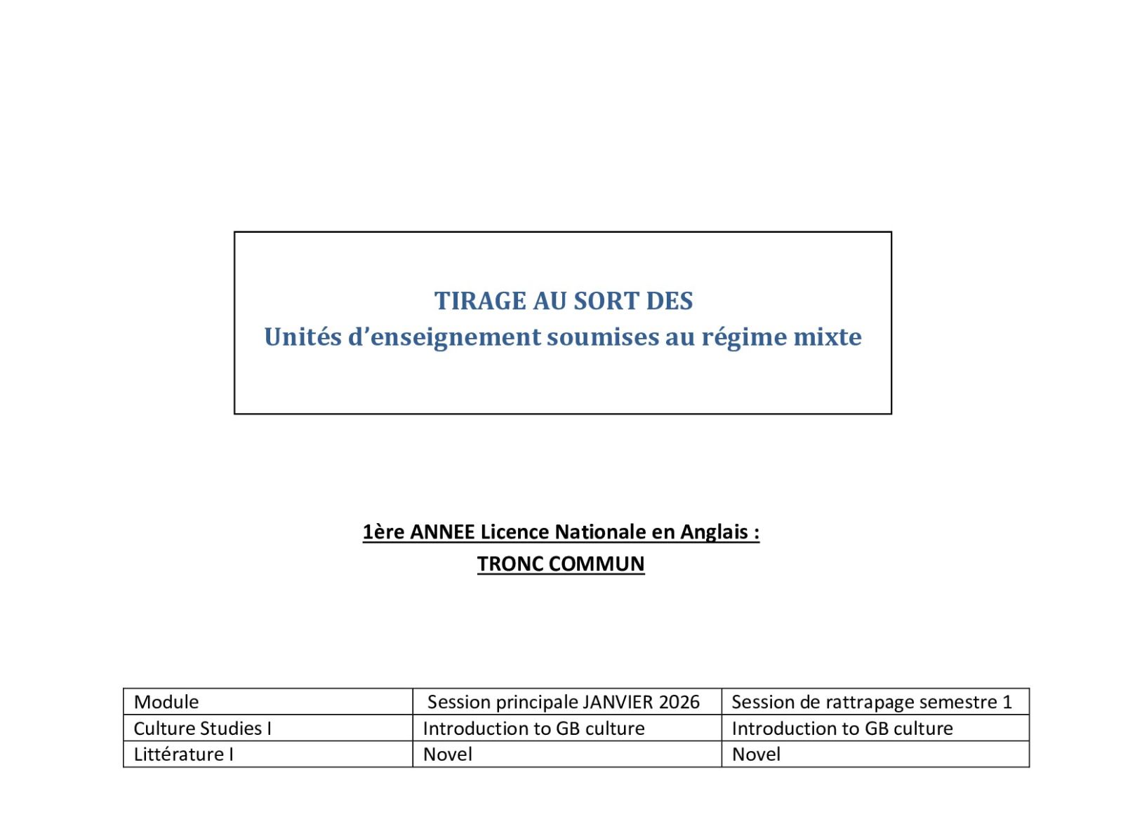 TIRAGE AU SORT DES Unités d’enseignement soumises au régime mixte( Licence Nationale en Anglais)