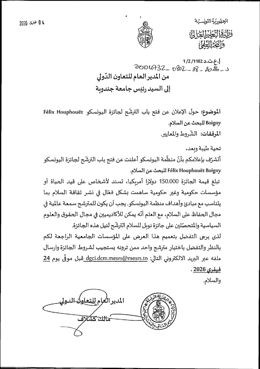 تشرف بإعلام بأن منظمة اليونسكو أعلنت عن فتح باب الترشح لجائزة اليونسكو Felix Houphouët Boigny للبحث عن السلام.